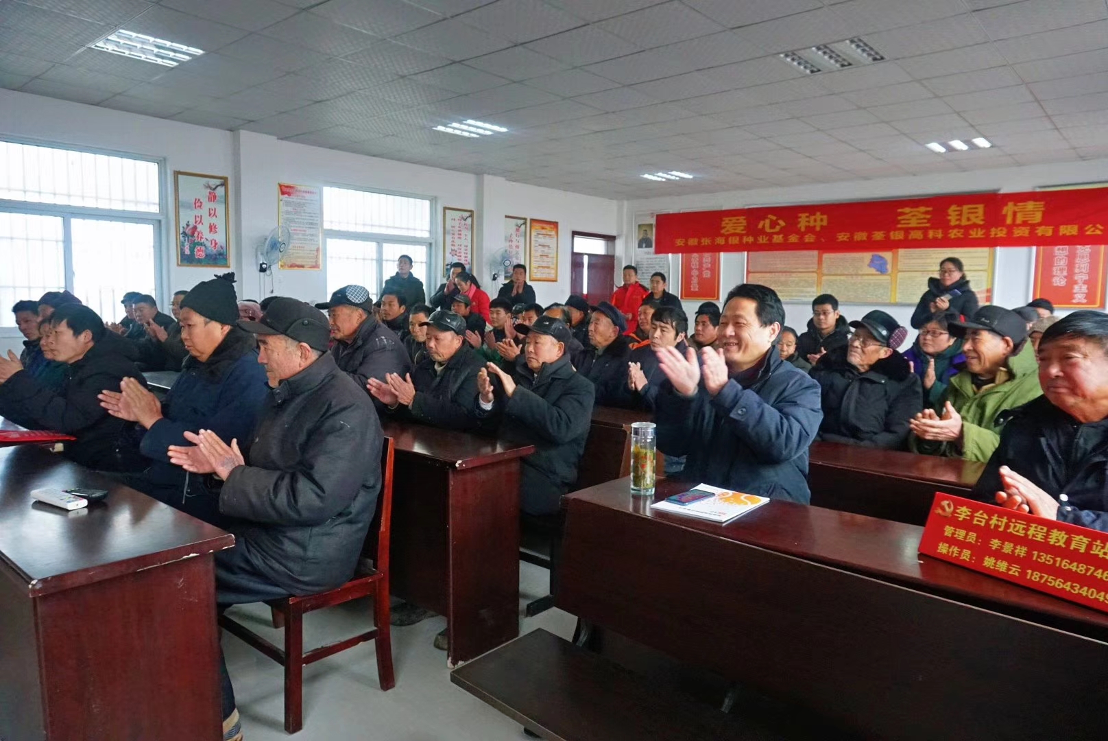??? 臘月的古城壽縣,寒風凜冽,壽縣迎河鎮(zhèn)李臺村村委會的會議室卻溫暖如春。1月12日,安徽荃銀高科農(nóng)投有限公司攜手安徽張海銀種業(yè)基金會及壽縣金豐公社有限公司走進壽縣迎河鎮(zhèn)開展“穗悅”精準扶貧項目活動。為當?shù)?0戶建檔立卡的貧困戶每戶送去優(yōu)質水稻種子和化肥。壽縣扶貧辦副主任徐中貴、縣殘聯(lián)副理事長陳慶華,壽縣迎河鎮(zhèn)黨委書記李景練、副鎮(zhèn)長戴紹江,基金會秘書長張彤、安徽荃銀高科農(nóng)投有限公司總經(jīng)理助理鄭運衛(wèi)、金豐公社總經(jīng)理滕玉磊等參加了活動。