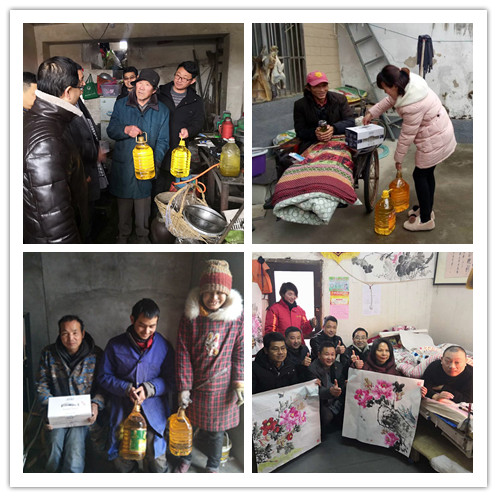 ??? 農(nóng)資捐贈活動結束后,荃銀農(nóng)投、基金會、壽縣金豐公社還為壽縣迎河鎮(zhèn)6戶因病因殘等病困家庭送去生活物品和慰問金。因車禍致殘癱瘓在床24年的韓兵用繩子綁住手,趴在床上的現(xiàn)場作畫,看到他身殘志堅,樂觀向上的精神,在場的每位人士深受感動和由衷欽佩。